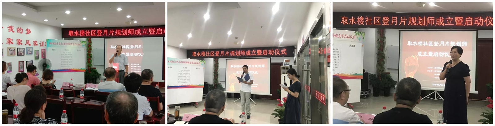 新华街办事处主任陈钢、副主任李菁,江汉区房管局副局长张峡、市场物业科科长张斌,江汉区规划局行政审批科科长张煜,新华街办事处公服办主任尹竞、武汉大学城市设计学院团队,取水楼社区副书记赵青出席了此次活动,并为取水楼社区首批18名社区规划师颁发了聘书,社区规划师们集体承诺,将做好社区规划改造行动中的主人翁,积极号召该辖区其他居民共同携手共建美好家园。