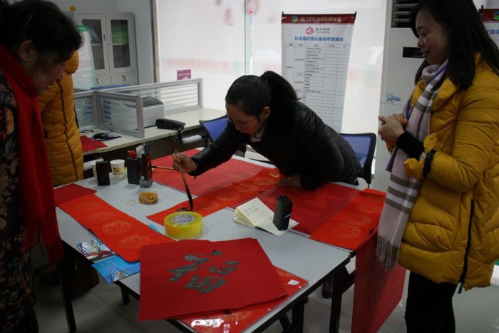 下午天公不作美下起了小雨,可是我们的活动场地内仍然暖意洋洋,有老年市民朋友冒雨赶来理发、验光活动,也有爷孙两被吸引进来参与活动学习剪窗花,在活动大厅里,一直在用心书写春联的志愿者老师不时得到大家称赞,纷纷领取飘着墨香的春联。